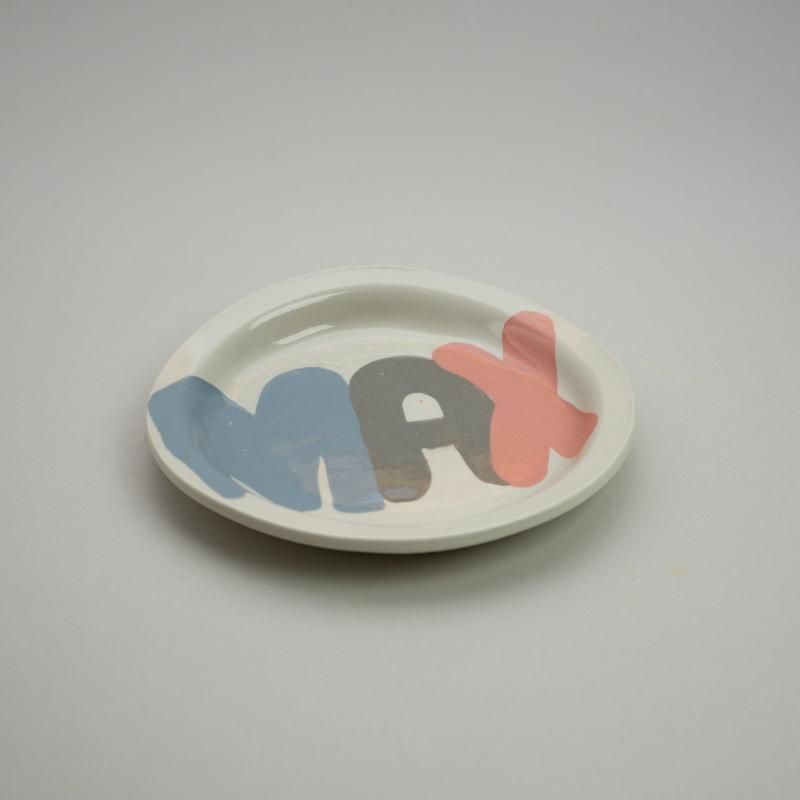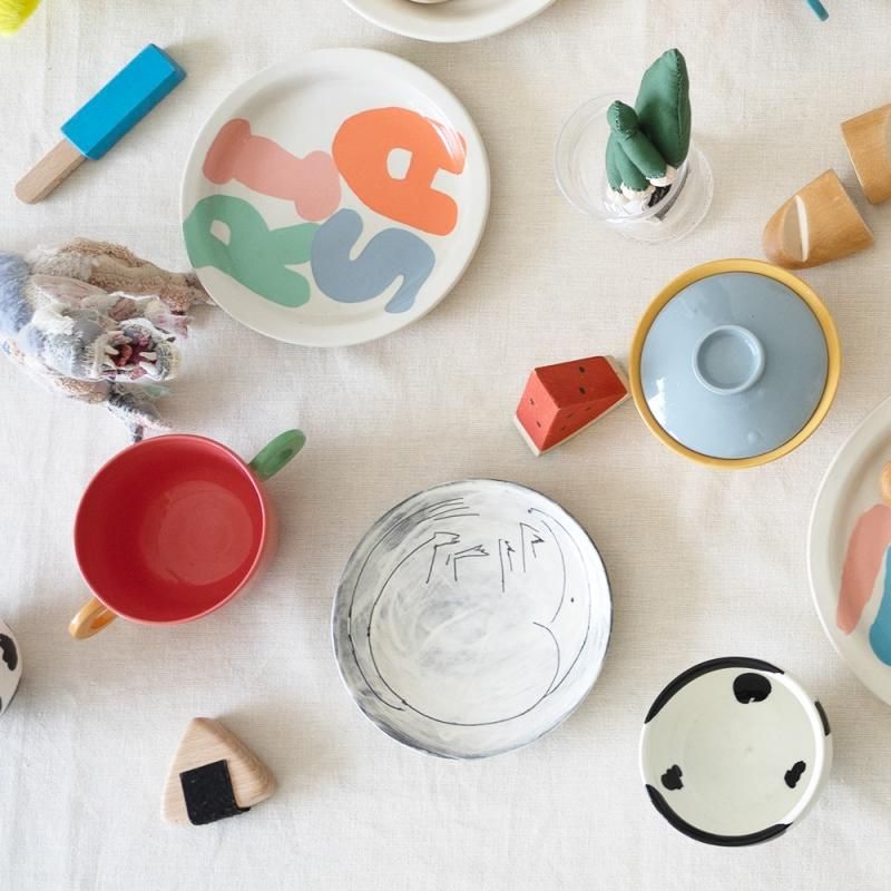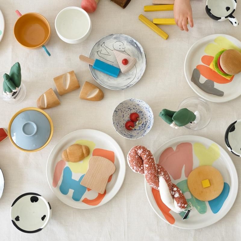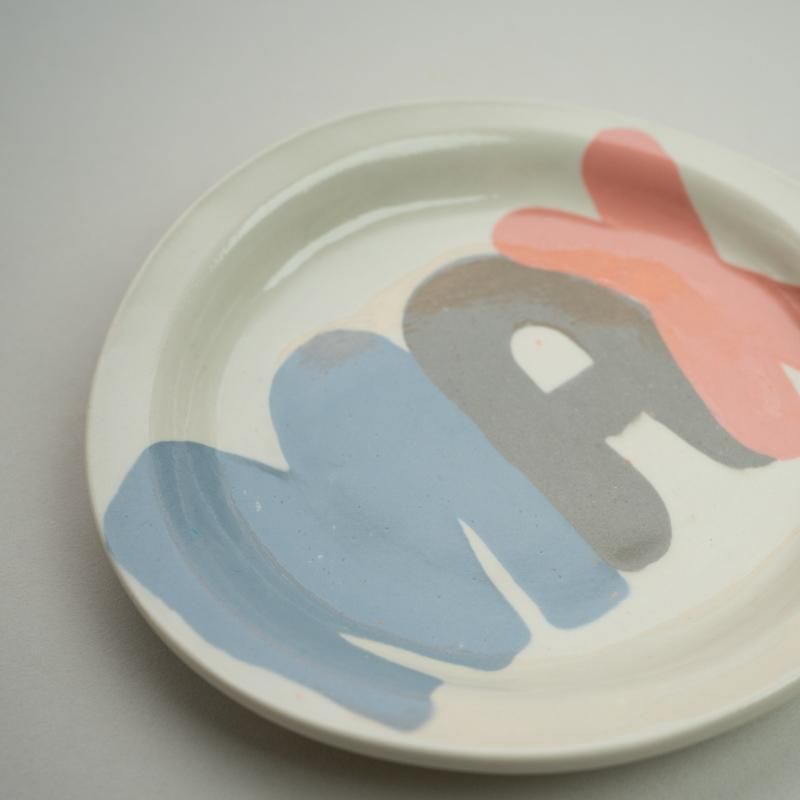 イニシャル(?)や英語のワード(時にスラング)が練り込みで大胆にあしらわれた、キュートなプレート。ハッピーなカラーリングでこどもも食事を楽しんでくれそう。自分や家族のイニシャルが見つかったらラッキー?