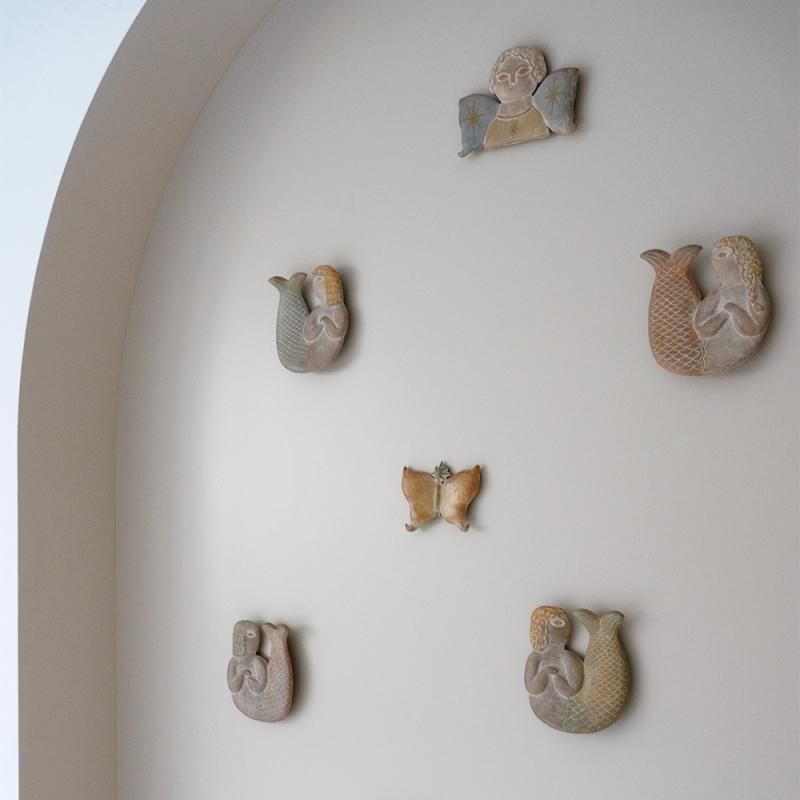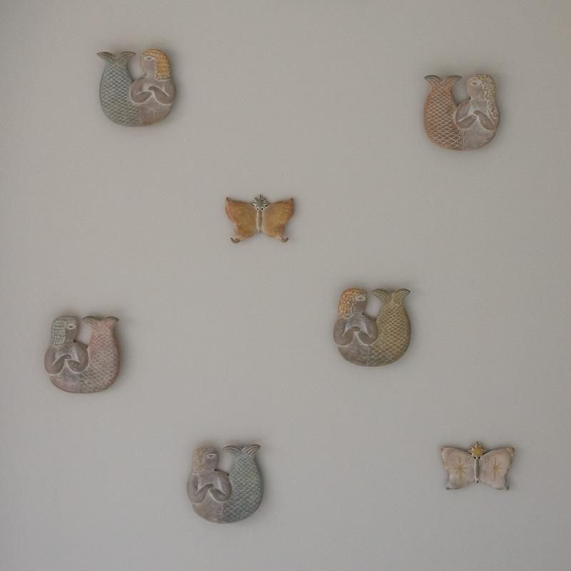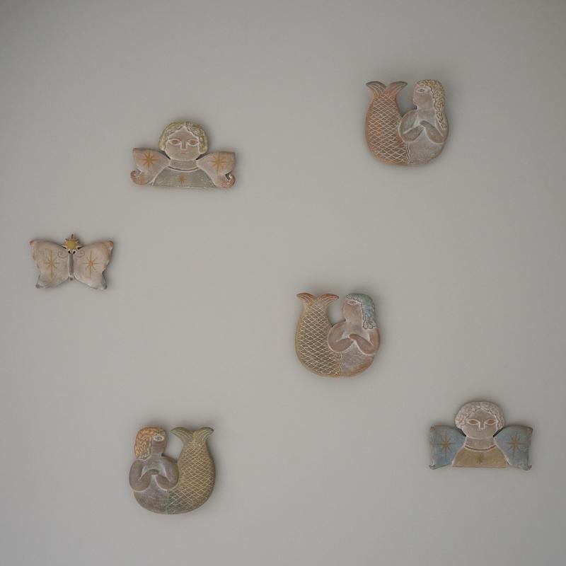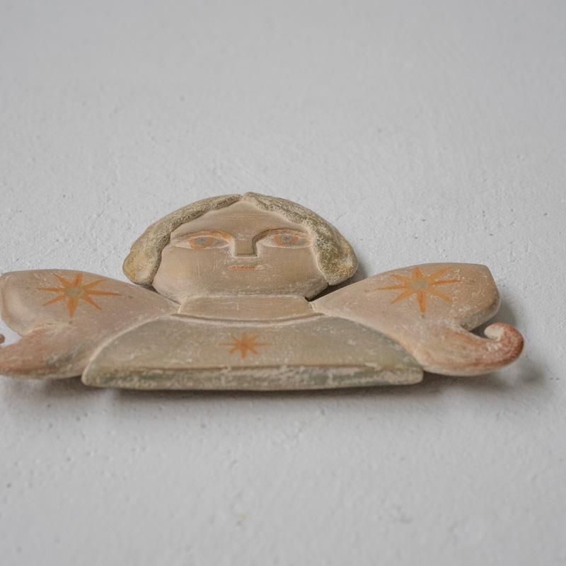 漆芸家・矢部桜による漆の壁掛け作品。パテ状にした漆を盛って成形し、彫りを入れた上からさらに色漆で着色しています。神話の世界から飛び出てきたようなモチーフと、日本の伝統工芸である漆が融合した、独特の世界観が魅力です。新作の壁掛けは、淡い色を施してあります。一点一点、表情や髪型も異なる点も魅力です。