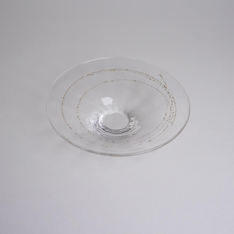 真鍮の泡を閉じ込めたガラスのプレート。ガラス特有の揺らぎ、星のような金の泡が美しい作品です。