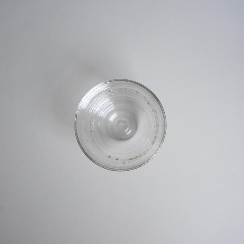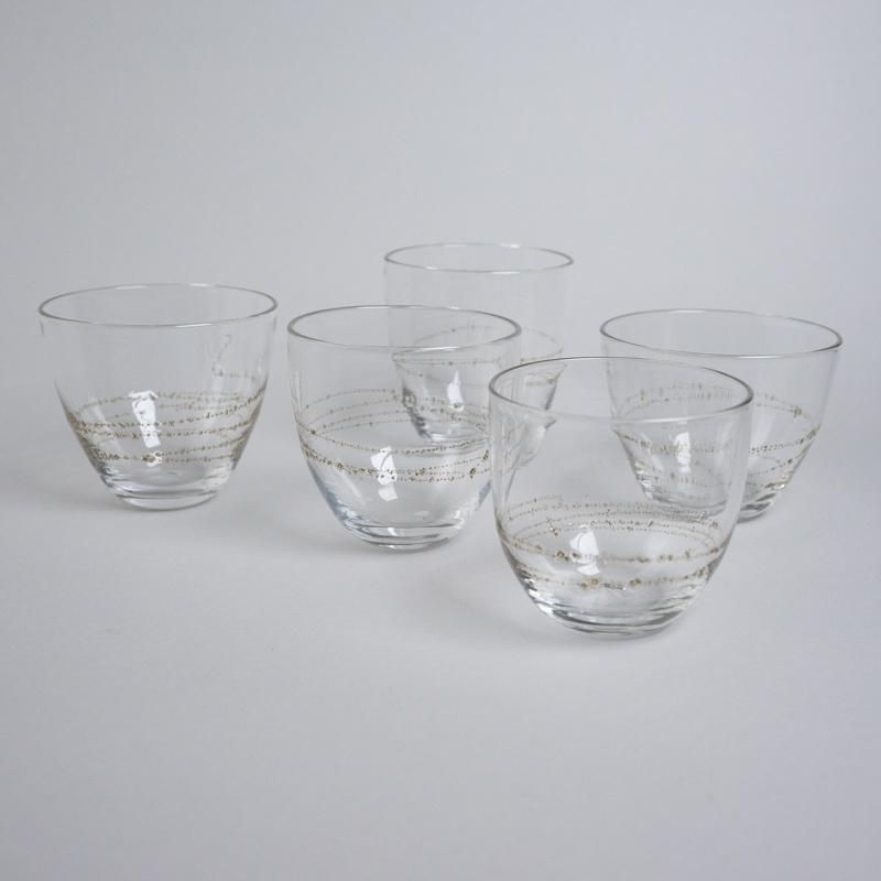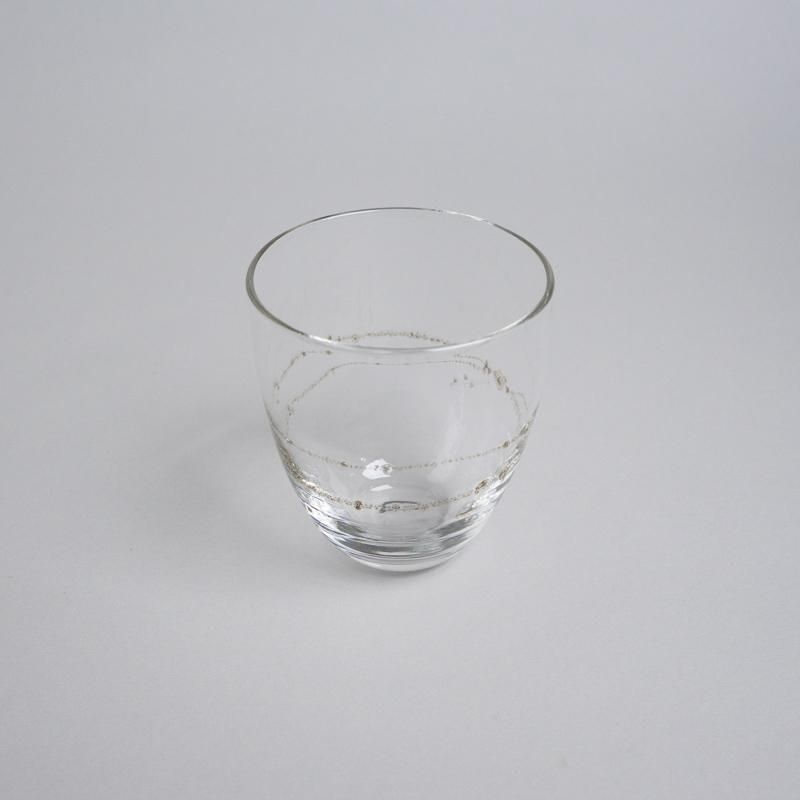 A glass cup capturing delicate bubbles of brass. Its gently flared shape allows for easy stacking, while remaining beautiful even when filled with a drink.