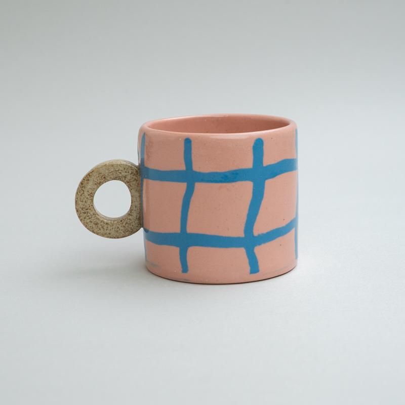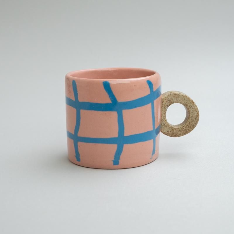 A cute mug with a loosely drawn check pattern. Its toy-like form and flat color tones add to the charm.