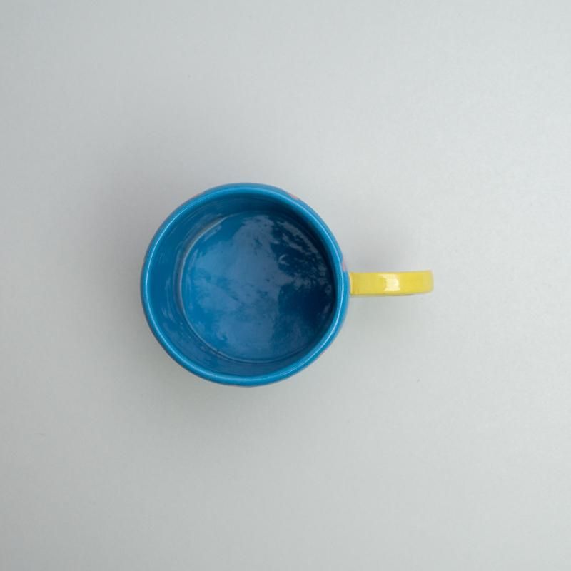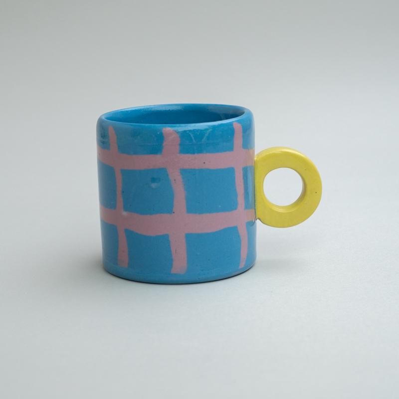 A cute mug with a loosely drawn check pattern. Its toy-like form and flat color tones add to the charm.