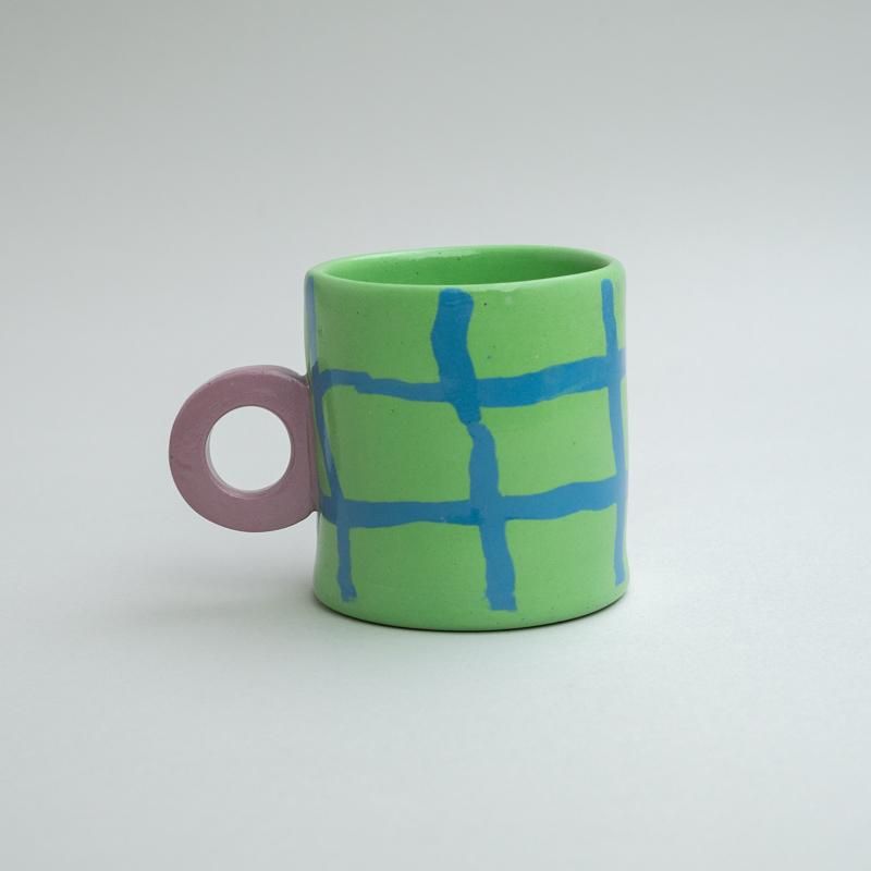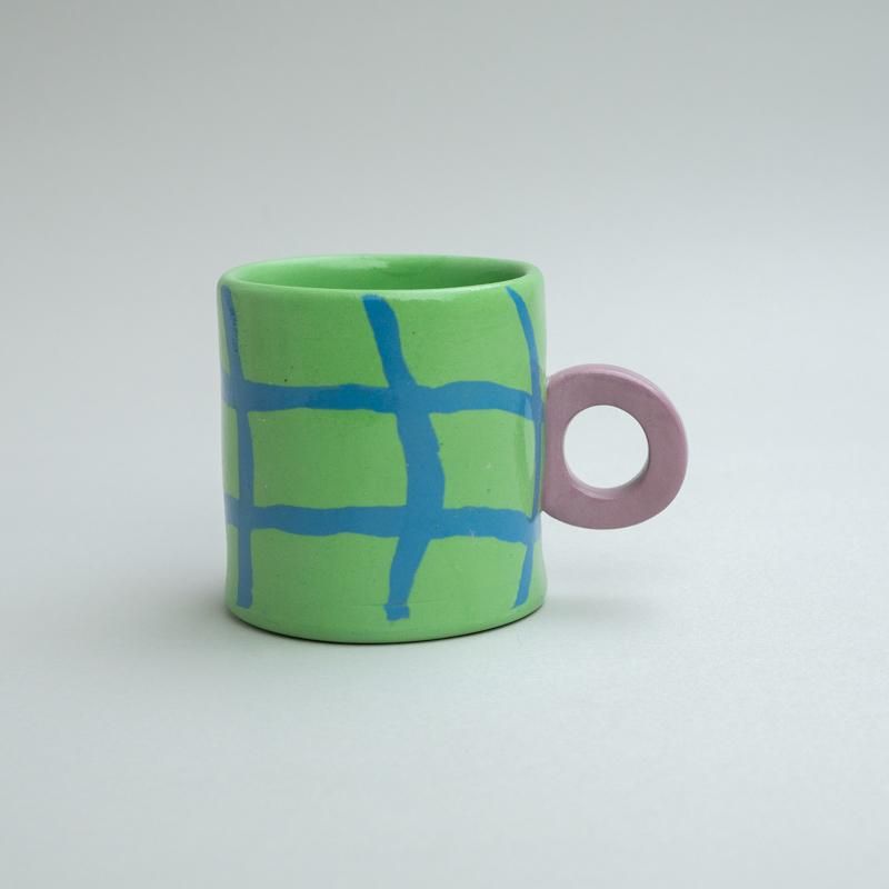 A cute mug with a loosely drawn check pattern. Its toy-like form and flat color tones add to the charm.