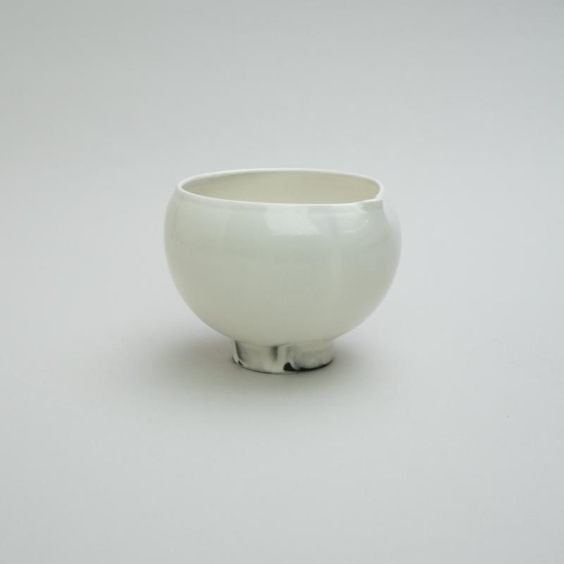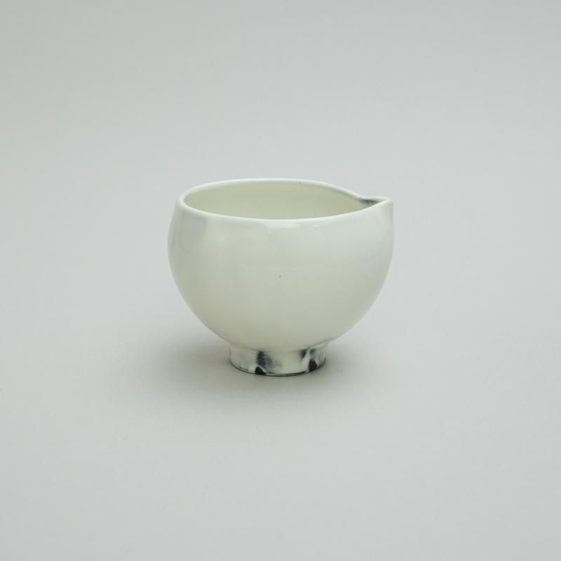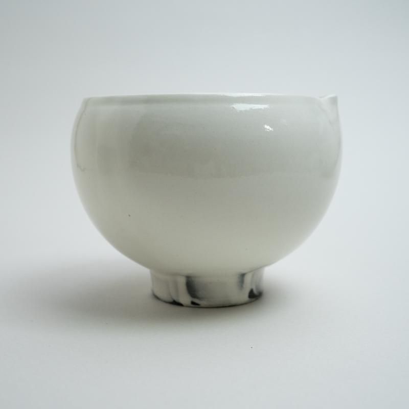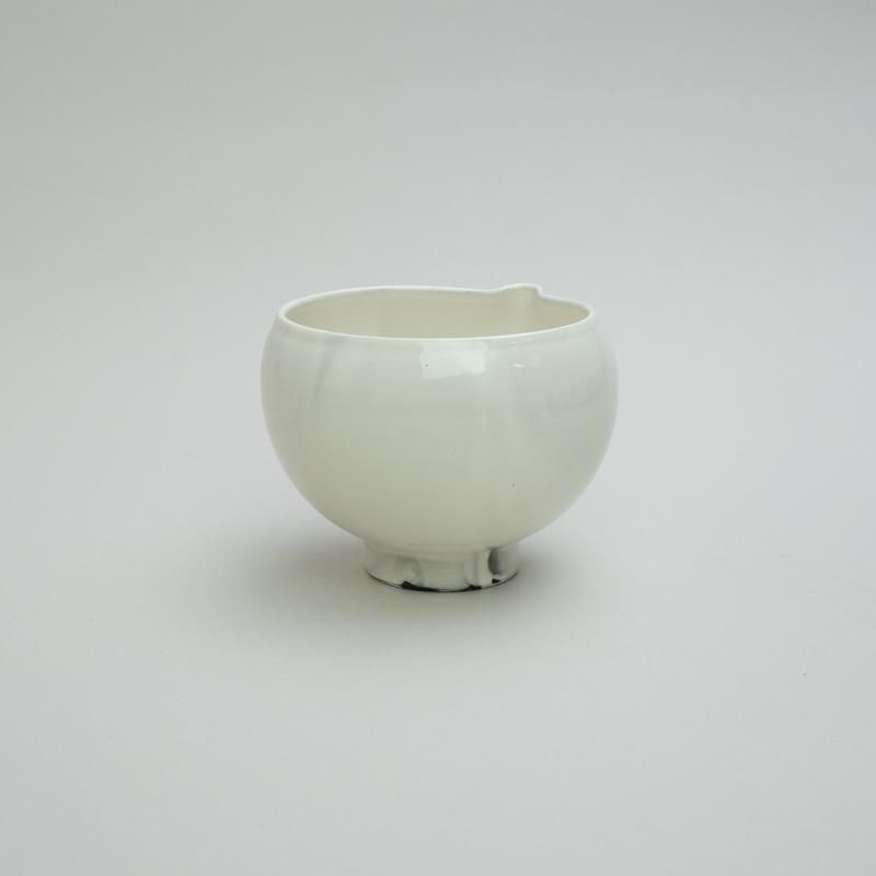 A rounded spouted bowl with a soft, endearing form. The plain white slip highlights its charm.