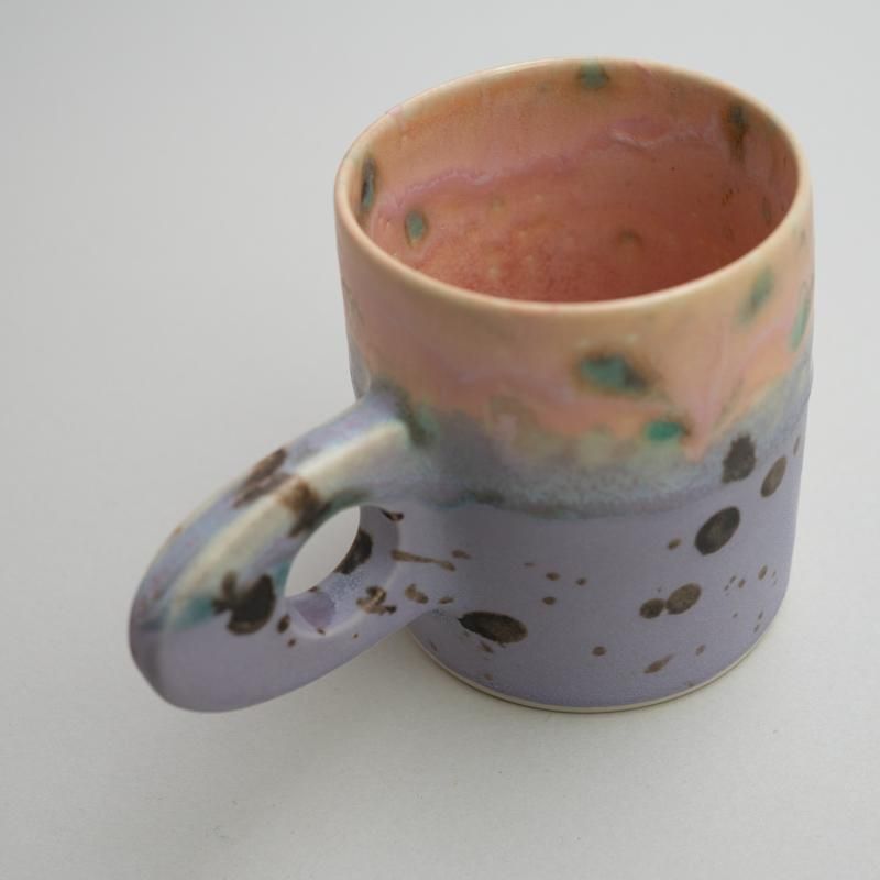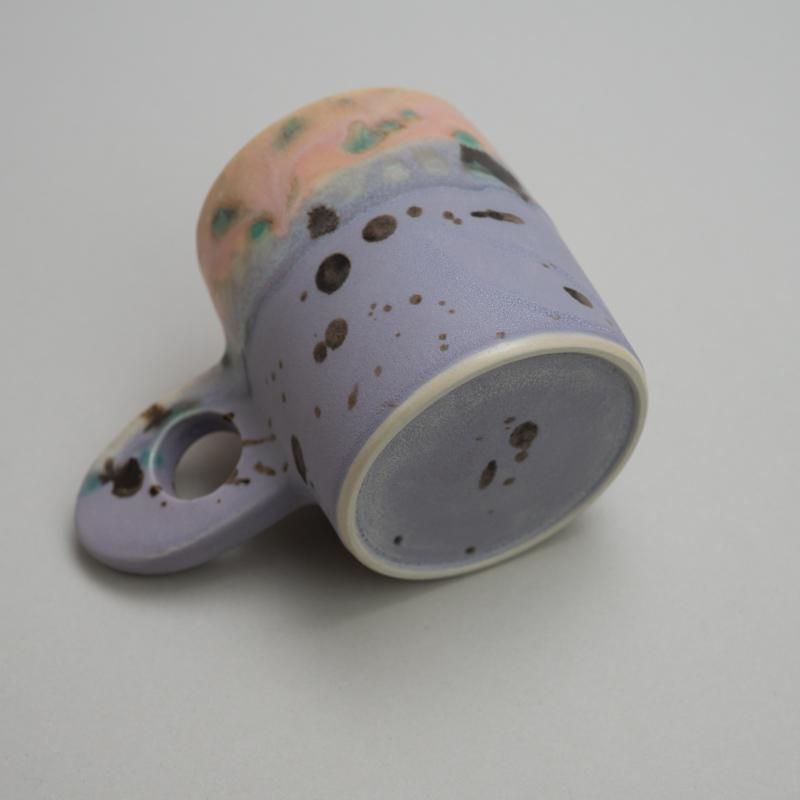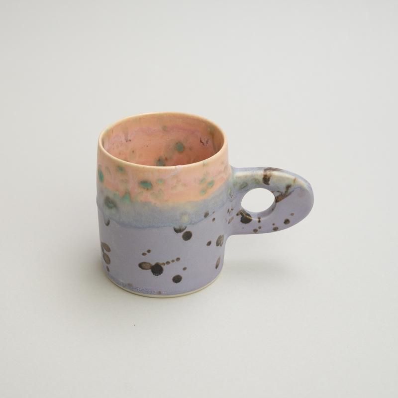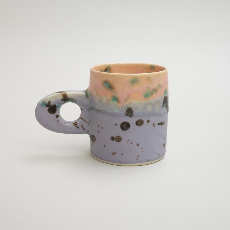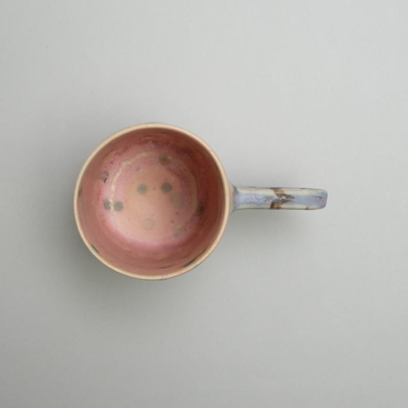 A cute mug with a distinctive handle design. The beautiful use of color, unique to Takemura’s work, is also a highlight.