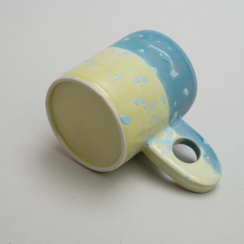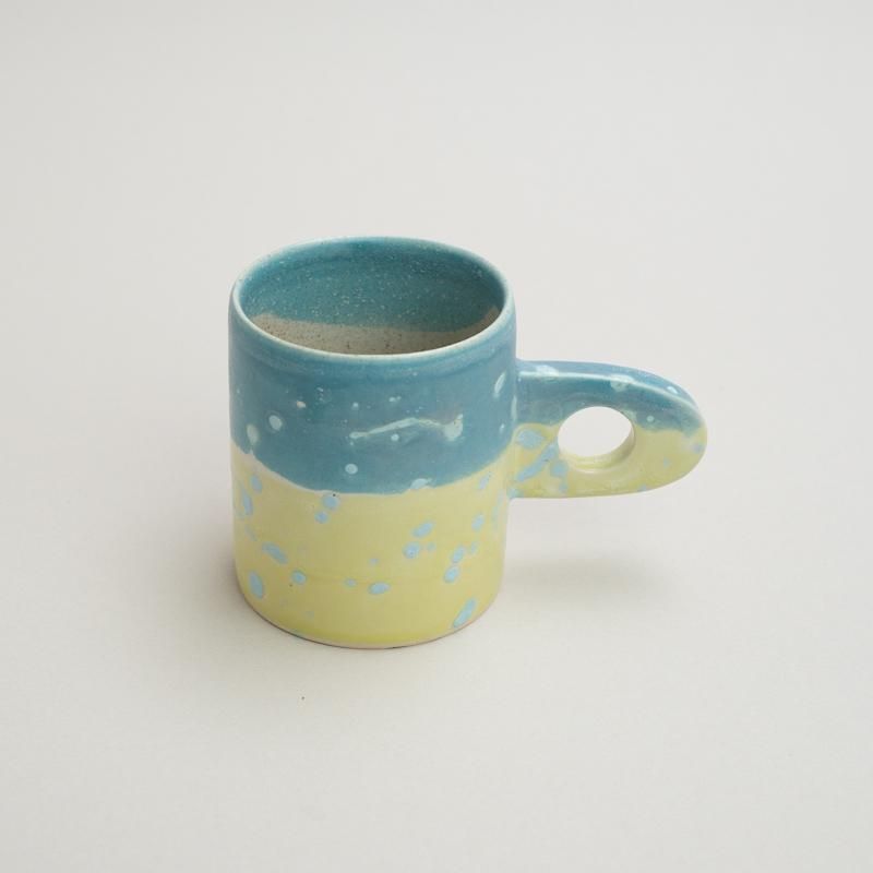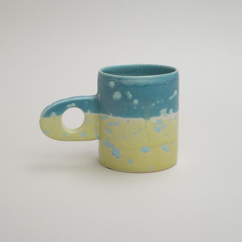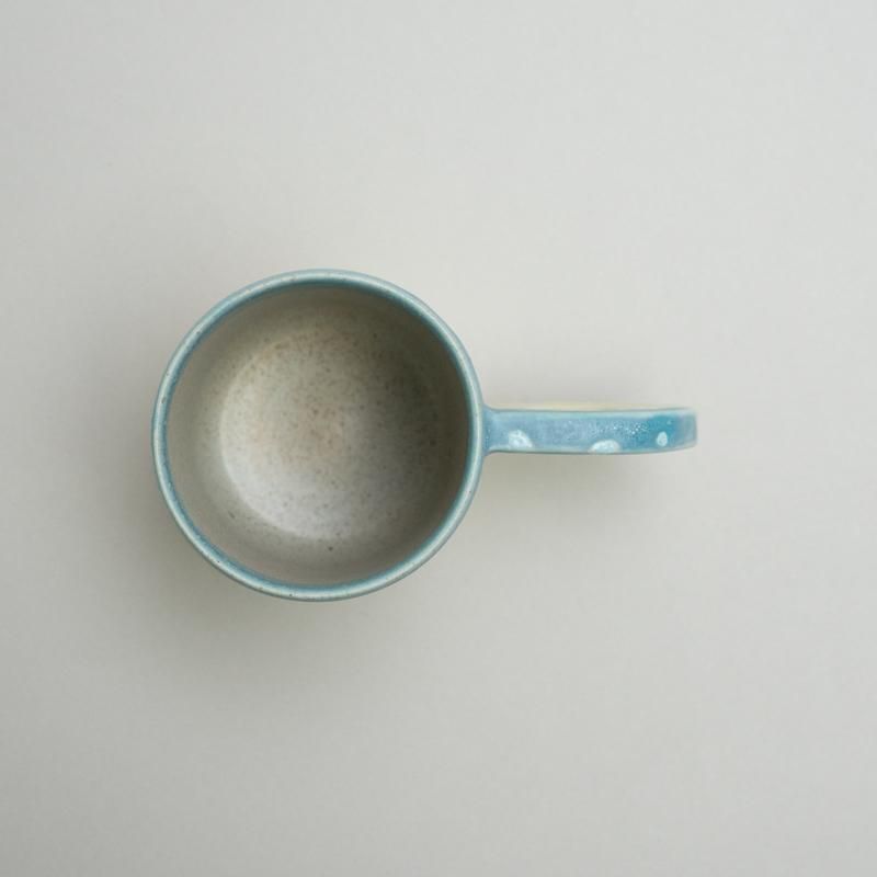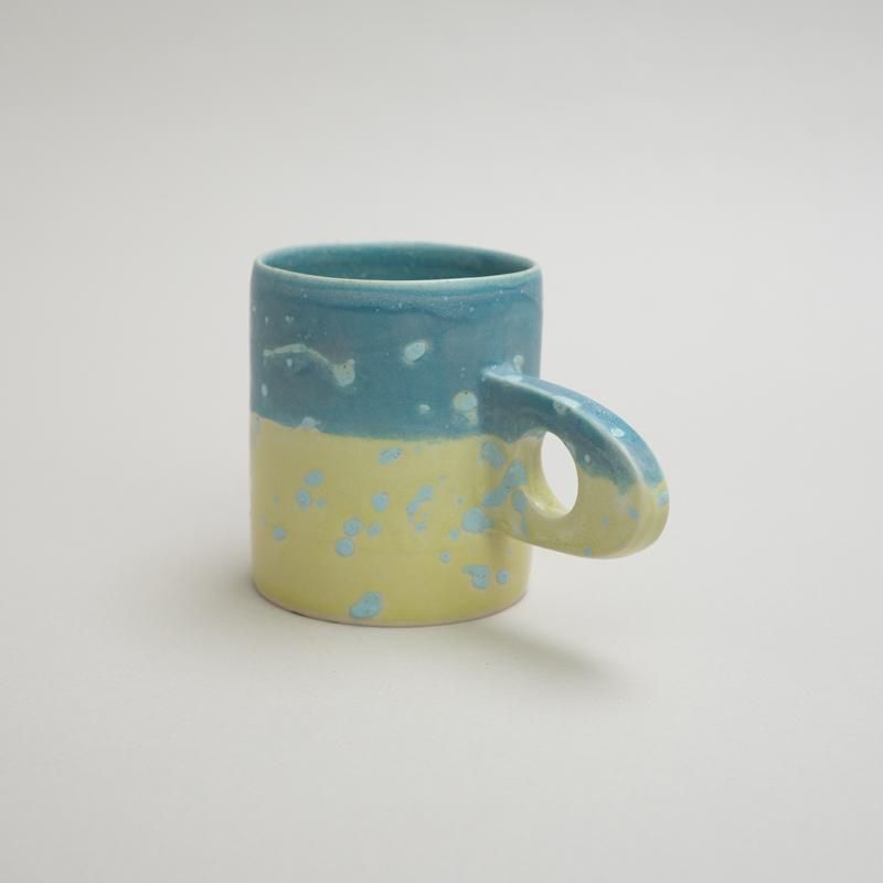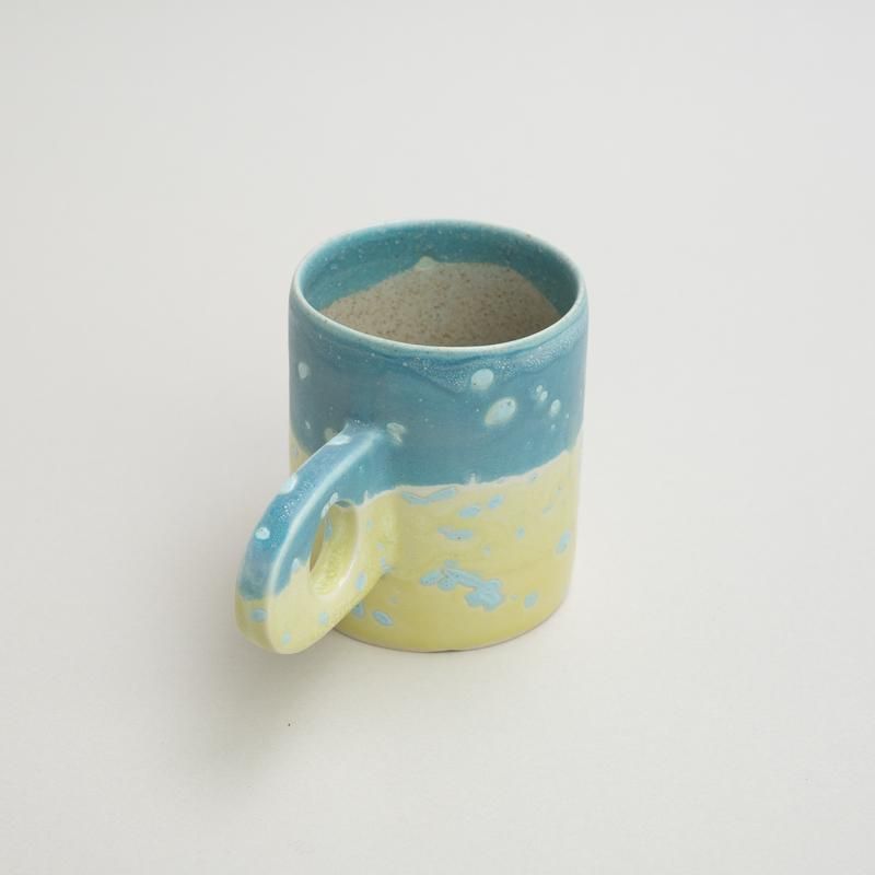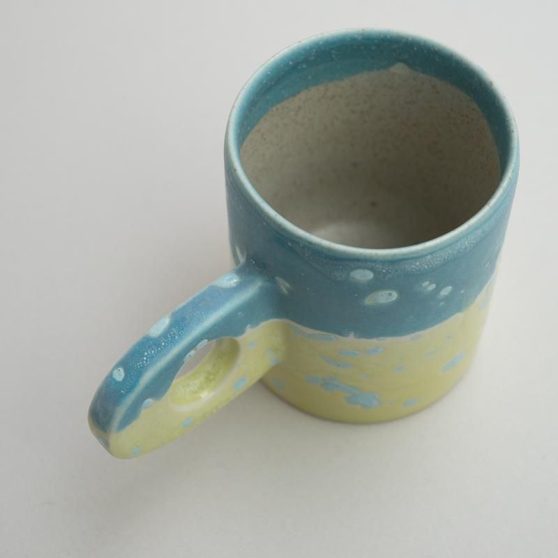 A cute mug with a distinctive handle design. The beautiful use of color, unique to Takemura’s work, is also a highlight.