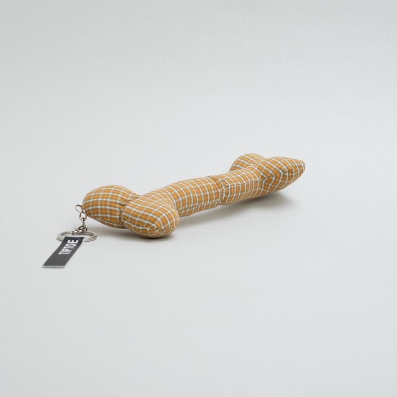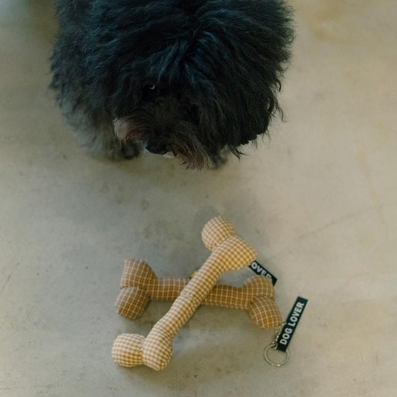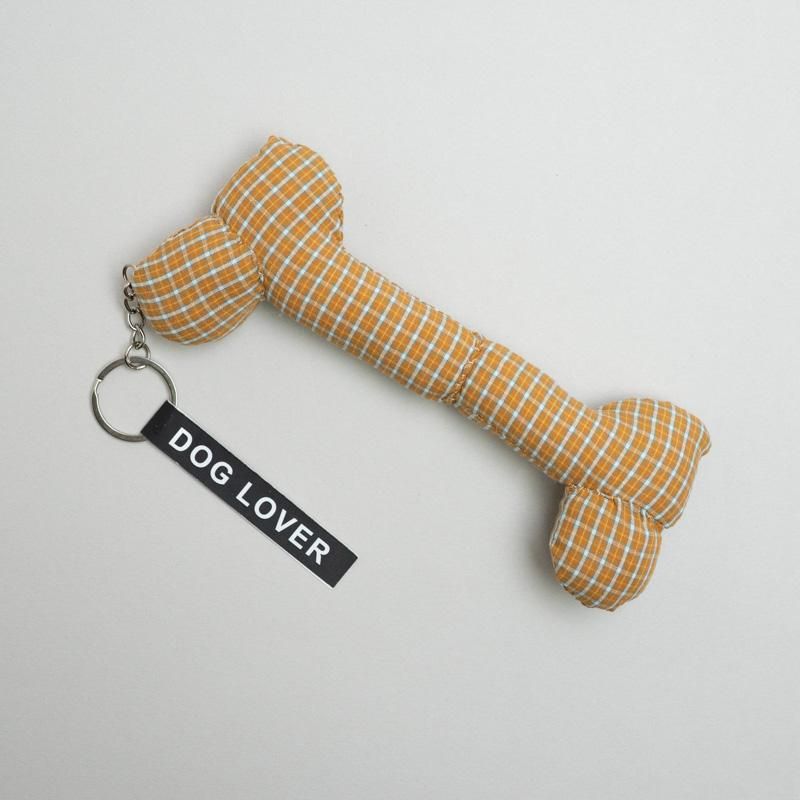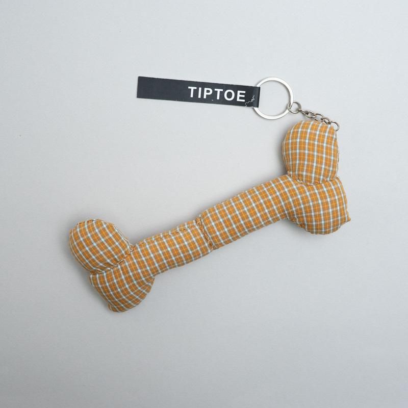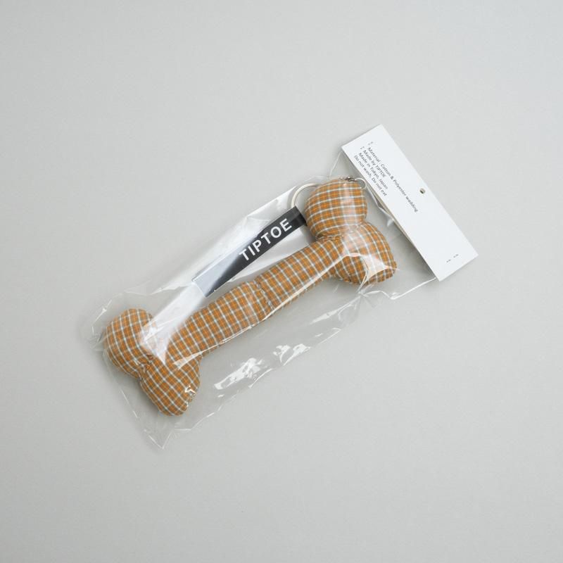 A bone biscuit_shaped keychain by TIPTOE. It perfectly embodies TIPTOE’s signature balance between handcrafted warmth and factory-made precision. The checkered fabric adds a cute touch.