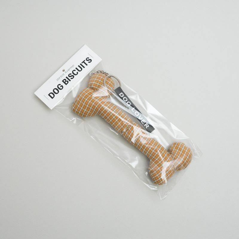 TIPTOEによる骨ビスケットのキーホルダー。TIPTOEらしい、手仕事感とファクトリープロダクト感が絶妙に共存した作品です。チェックのファブリックもキュート。