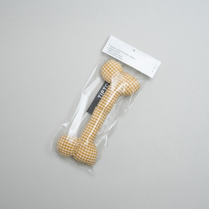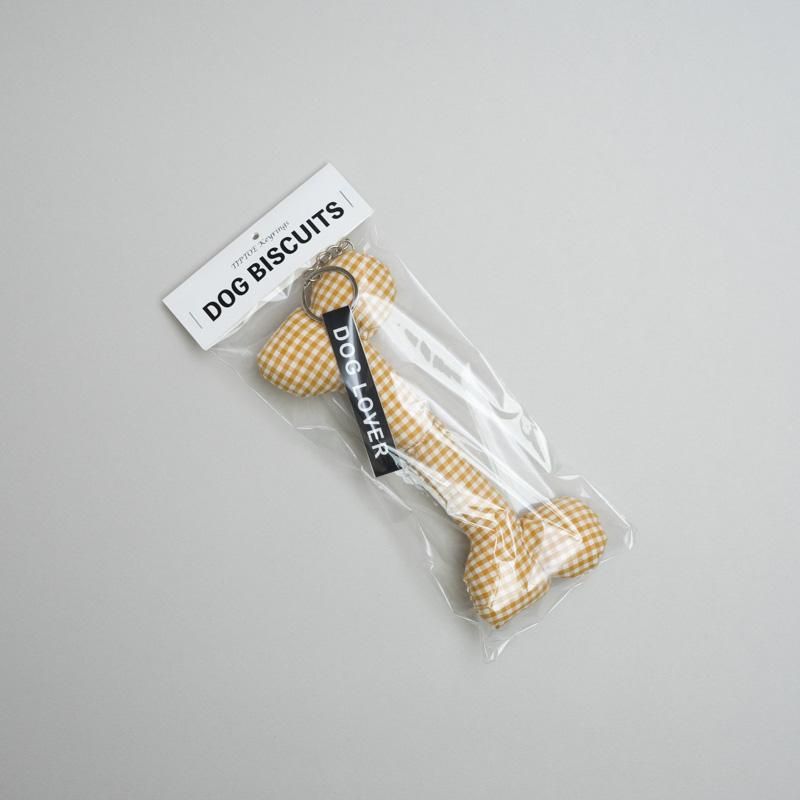TIPTOEによる骨ビスケットのキーホルダー。TIPTOEらしい、手仕事感とファクトリープロダクト感が絶妙に共存した作品です。チェックのファブリックもキュート。