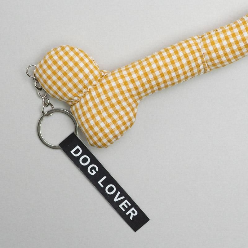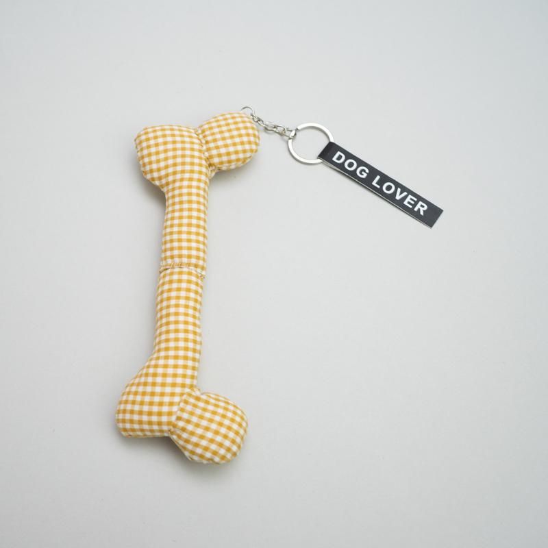A bone biscuit_shaped keychain by TIPTOE. It perfectly embodies TIPTOE’s signature balance between handcrafted warmth and factory-made precision. The checkered fabric adds a cute touch.