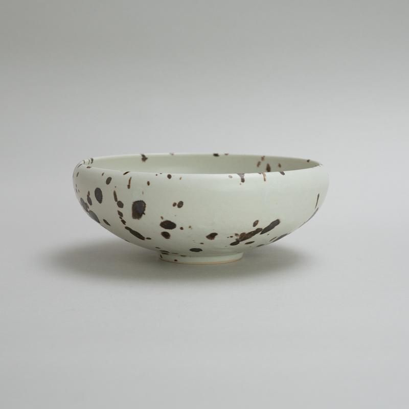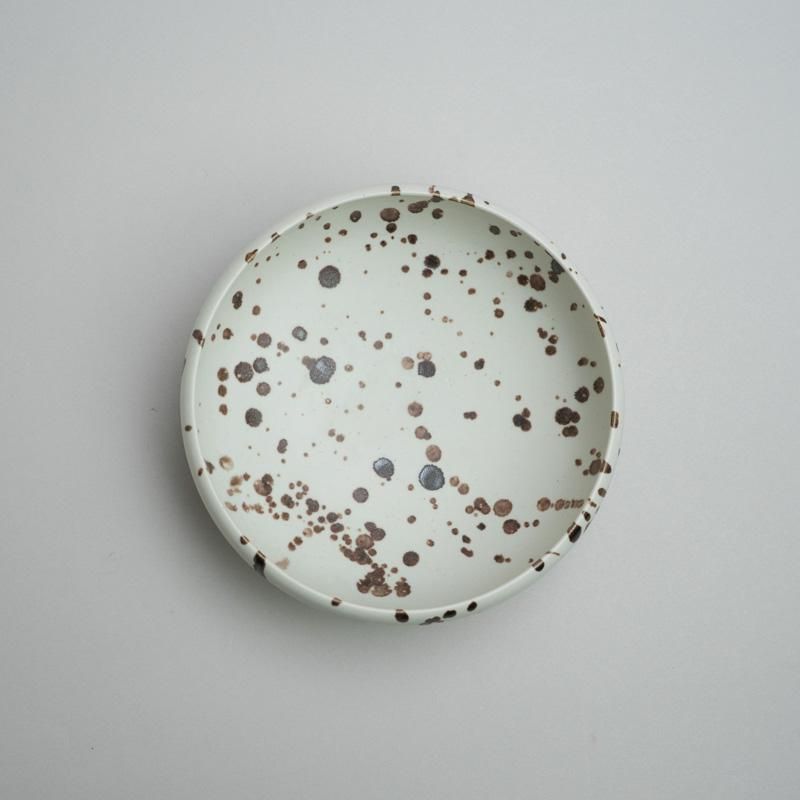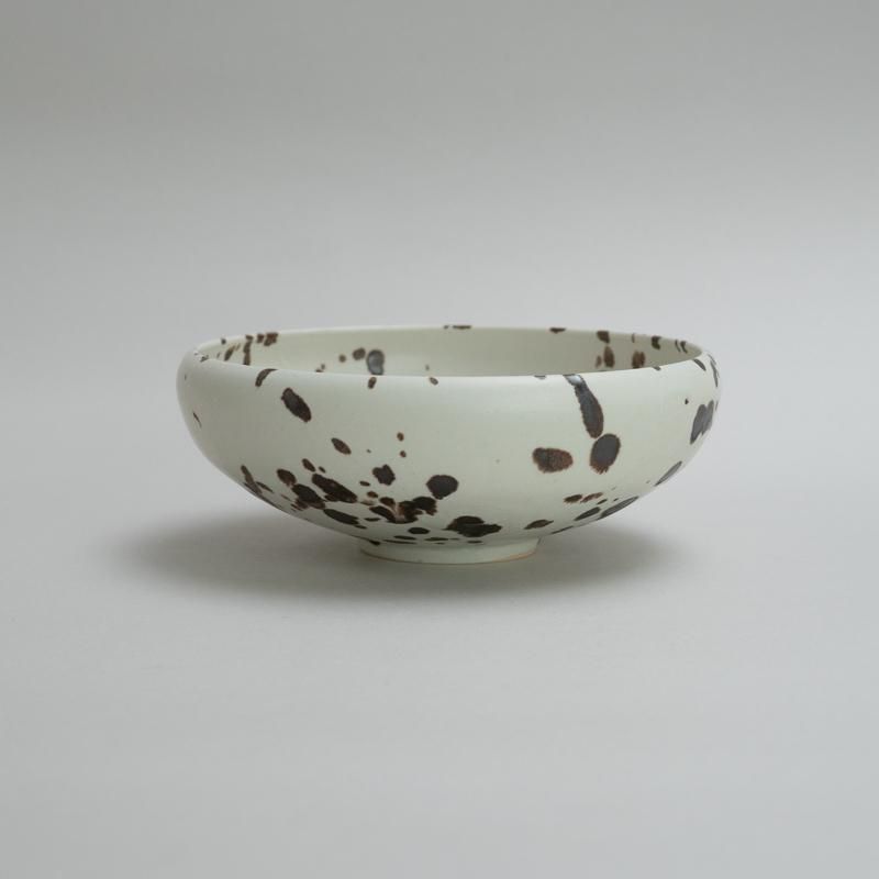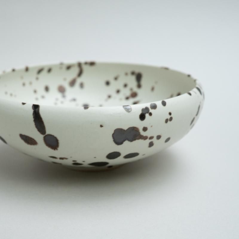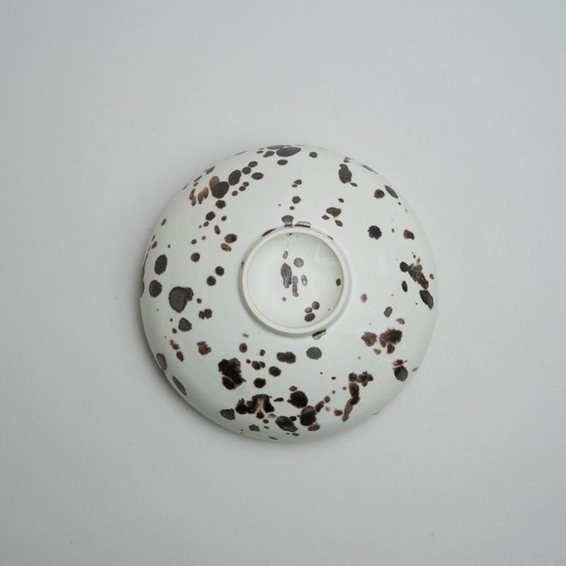 ころんとしたフォルムがキュートな浅鉢。モノトーンの飛ばし柄はどんなインテリアにもマッチ。ホリデーシーズンにも、おすすめです。