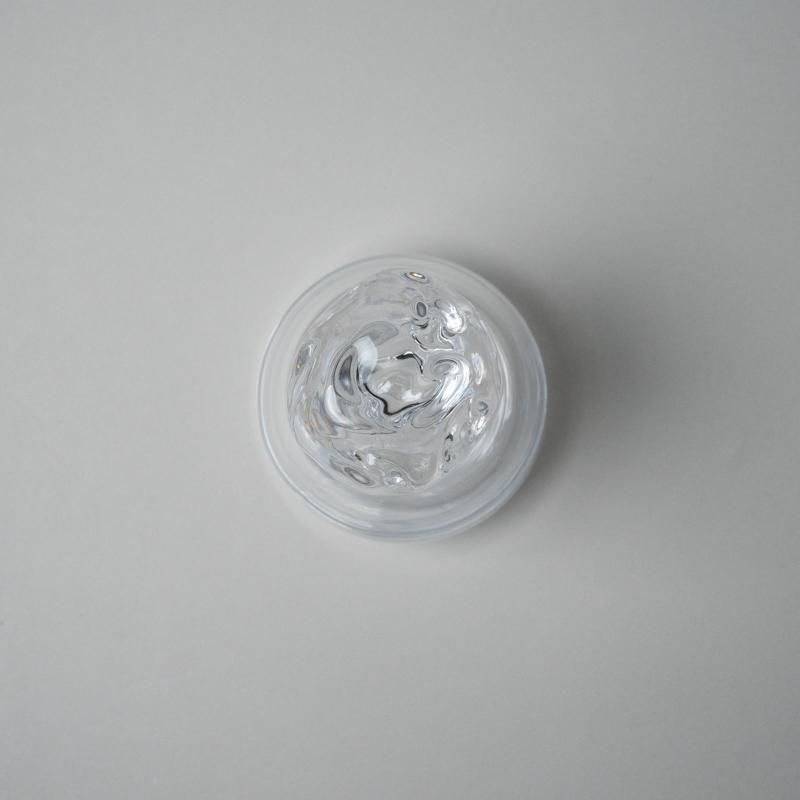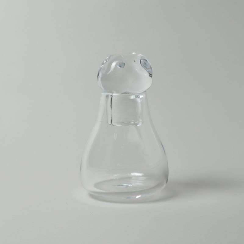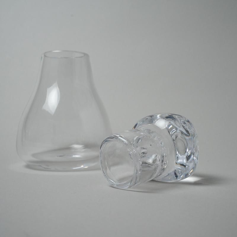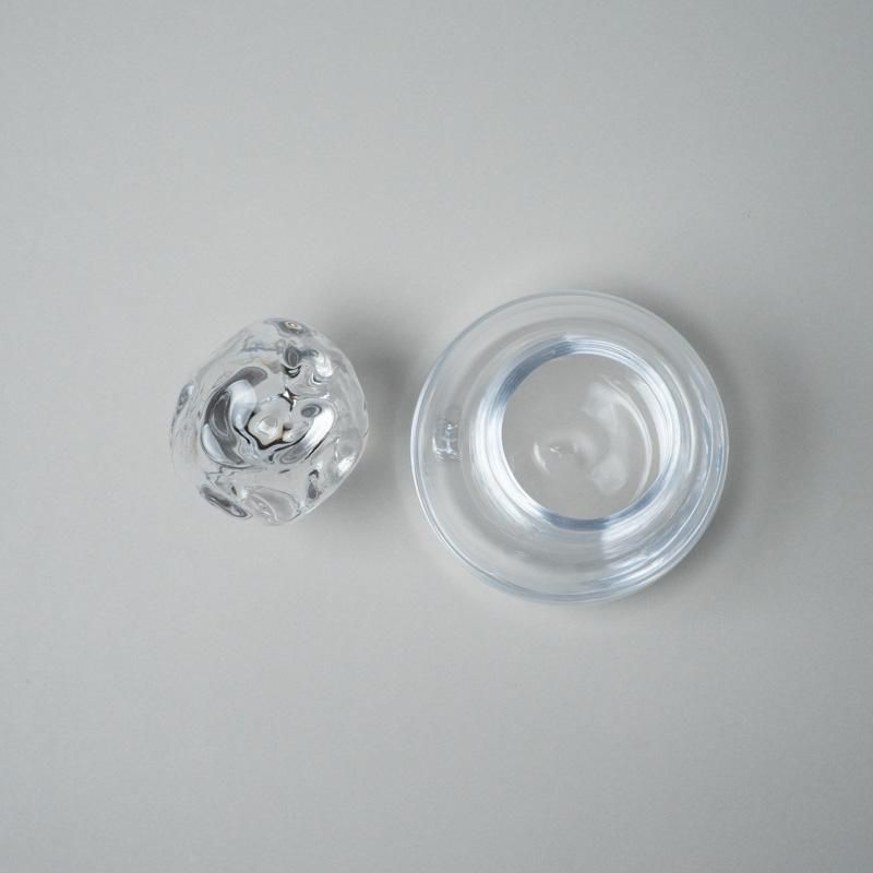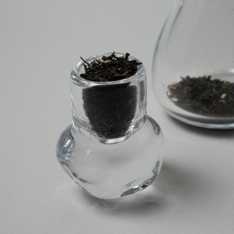 A glass tea leaf container. The inside of the lid measures approximately 5_g of tea leaves. Its fluid, water-like surface and asymmetrical form exude a sensual, captivating charm.
