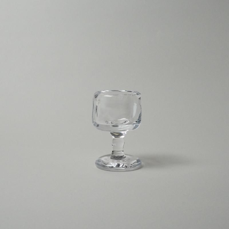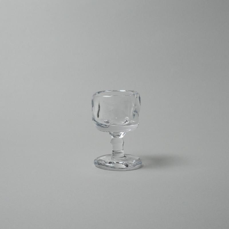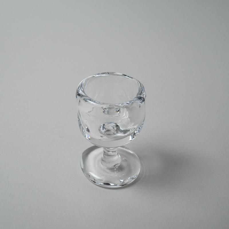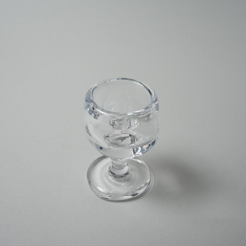 ガラスのキャンドルホルダー。水を湛えたような揺らぎ、アシンメトリーなフォルムが官能的な魅力溢れる作品です。ワイングラスのような佇まいも、キュートです。