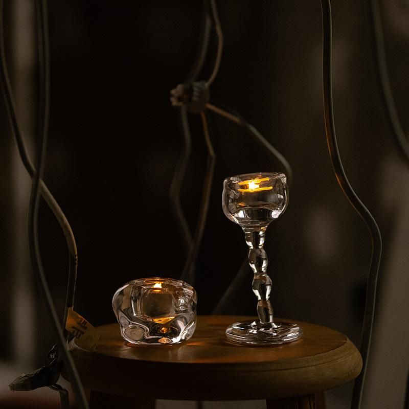 A glass candle holder with a fluid, water-like surface. Its asymmetrical form radiates sensual elegance, and the slender stem creates a graceful silhouette. Its wine-glass_like presence adds a touch of charm.