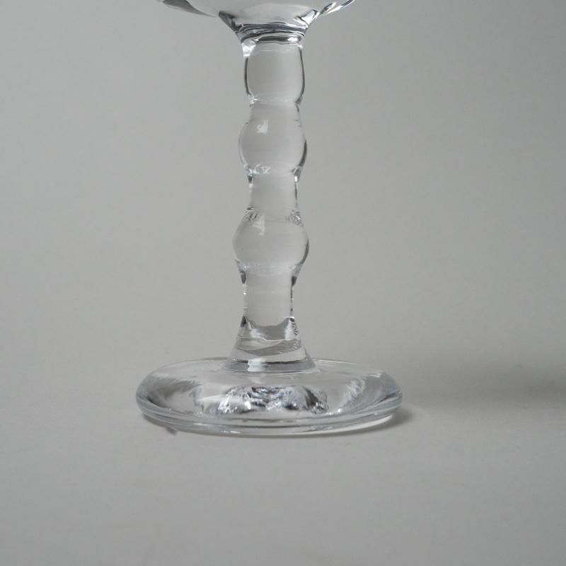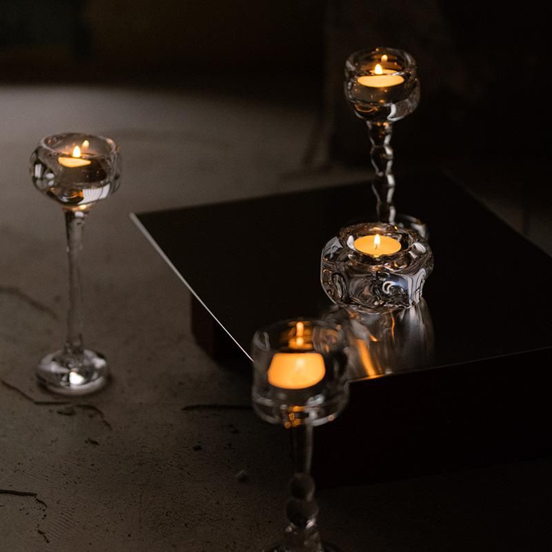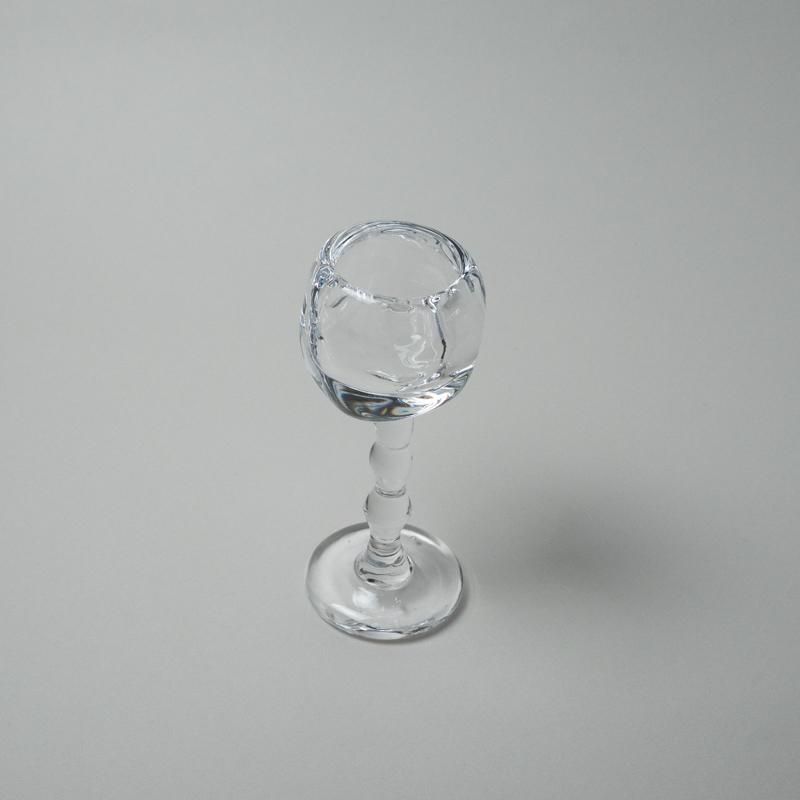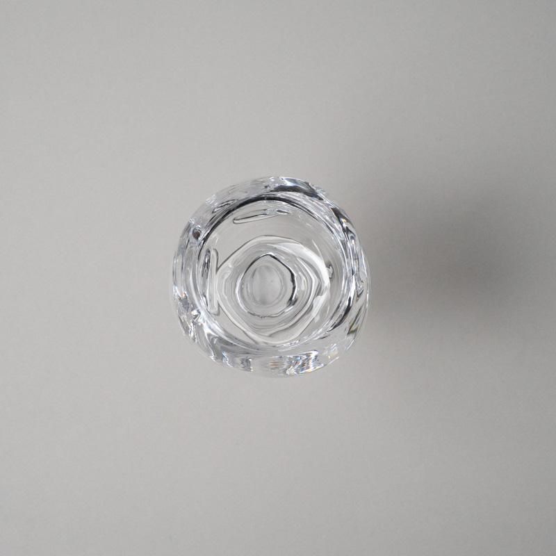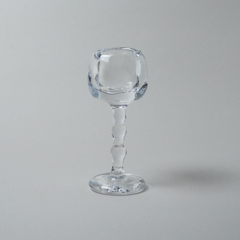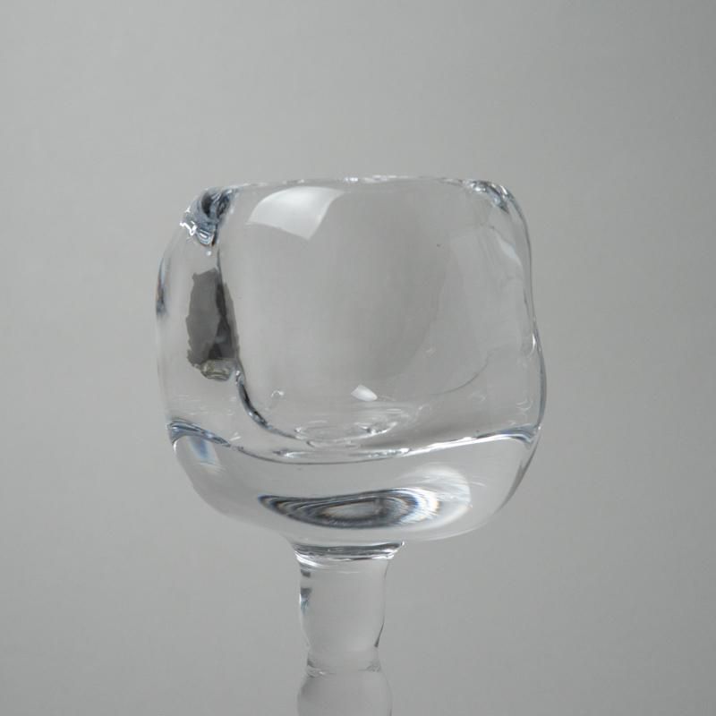 ガラスのキャンドルホルダー。水を湛えたような揺らぎ、アシンメトリーなフォルムが官能的な魅力溢れる作品です。すっと脚の伸びた美しい佇まいは、オブジェとして置いてあるだけで様になります。