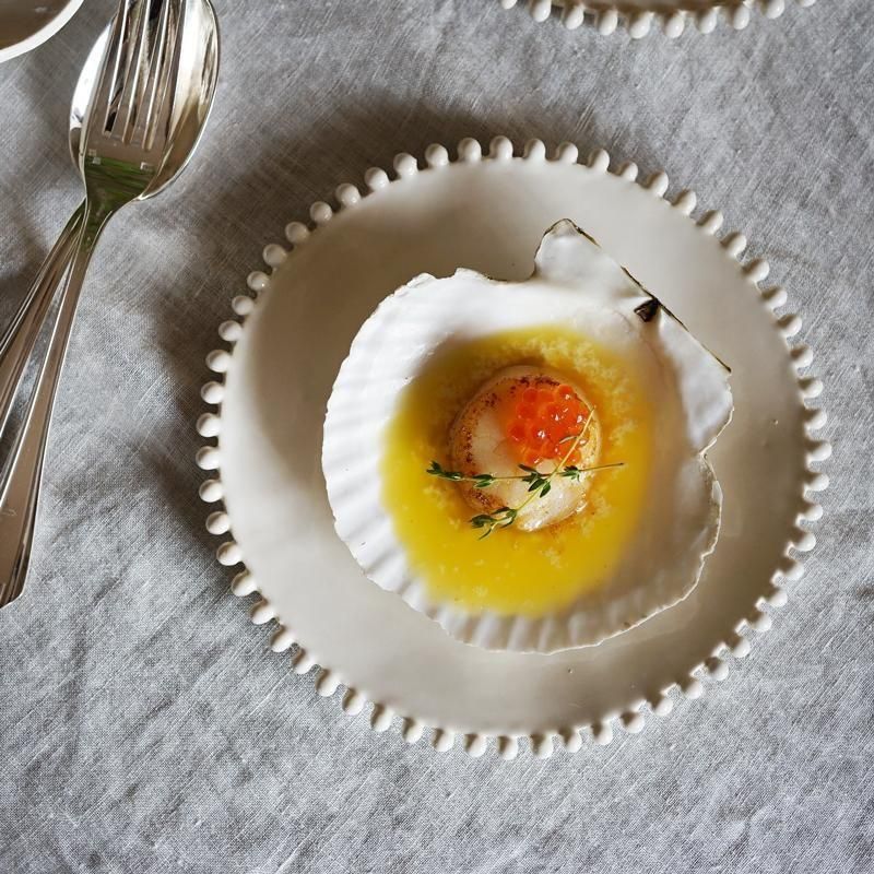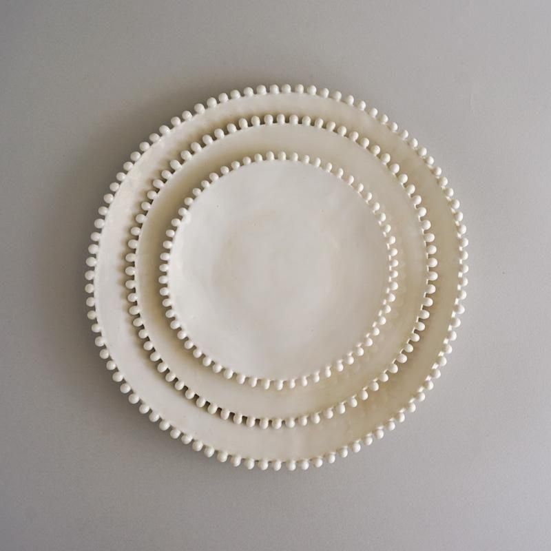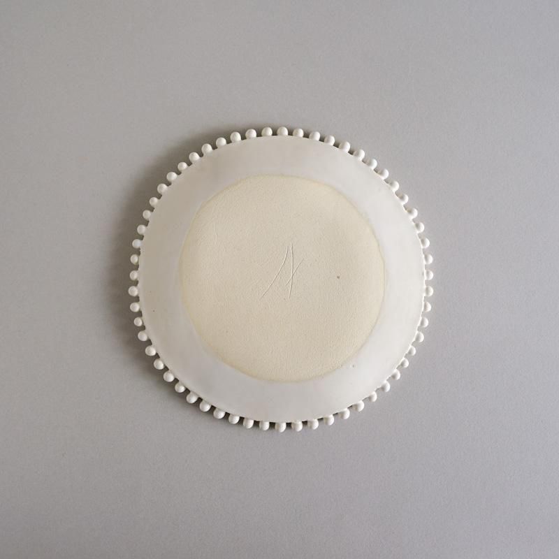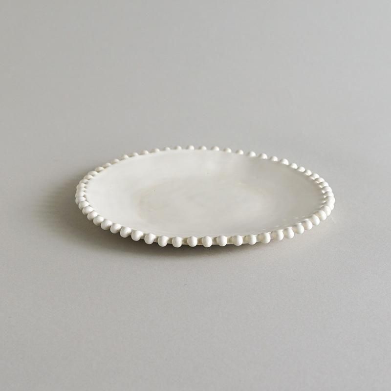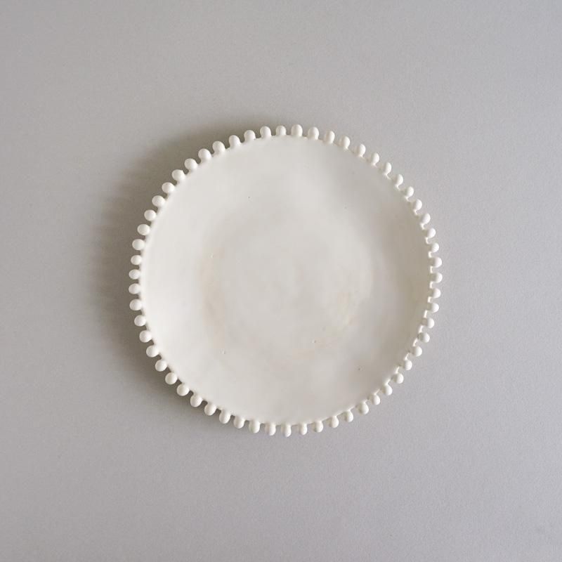 真珠の首飾りのように、土の粒が丹精に並べられたプレート。敢えてゆがみや不均一さ、道具の跡を残した器は、料理に自然と馴染み、より美しく引き立てます。色はヌードとホワイトの2色展開です。