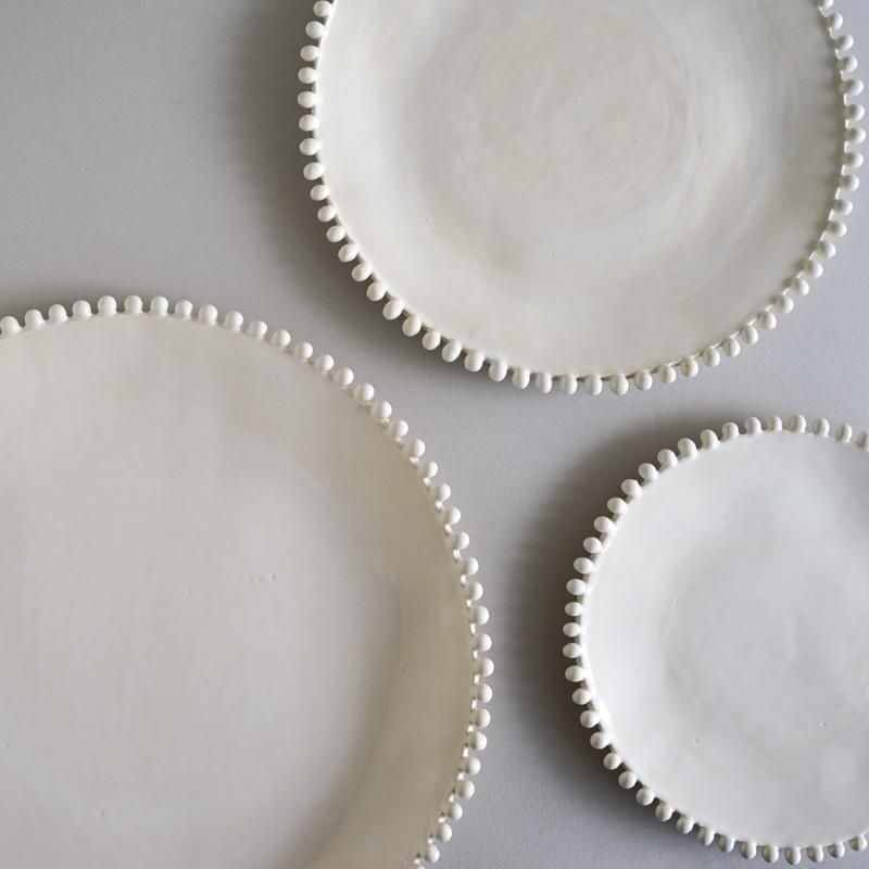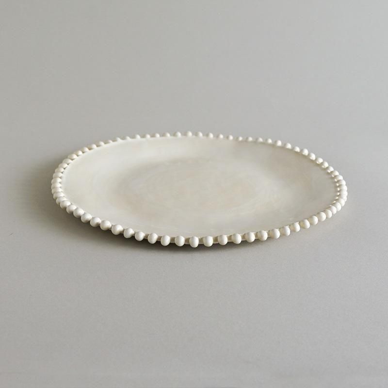 真珠の首飾りのように、土の粒が丹精に並べられたプレート。敢えてゆがみや不均一さ、道具の跡を残した器は、料理に自然と馴染み、より美しく引き立てます。